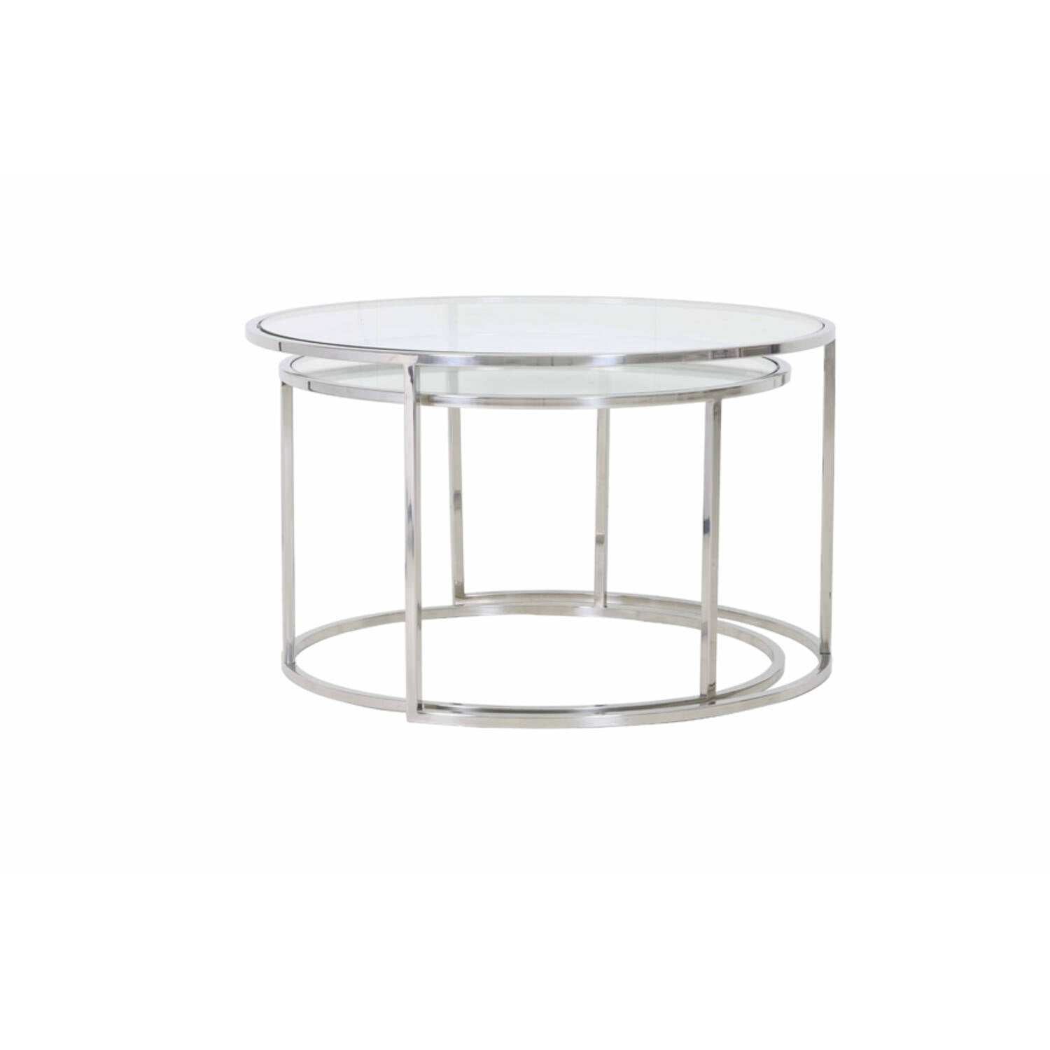 Zwei verschachtelte Couchtische mit schlanken, nickelglänzenden Metallrahmen und klaren Glasplatten bringen Leichtigkeit und Struktur ins Wohnzimmer. Die unterschiedlichen Durchmesser (Ø65×H39 cm und Ø75×H44 cm) ermöglichen flexibles Arrangieren und bieten viel Ablagefläche, ohne den Raum zu erdrücken. Robuste Metallfüße und gehärtete Glasplatten sorgen für stabile Nutzung und Alltagstauglichkeit. Pflegeleichtes Design: Glas mit Glasreiniger, Metall mit weichem Tuch abwischen.
